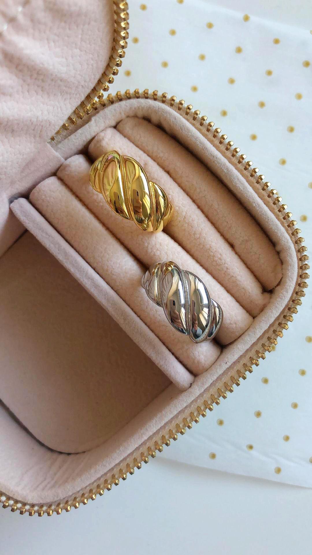 • Duas alianças torcidas dourada e prateada numa caixa de veludo cor de rosa com zíper dourado