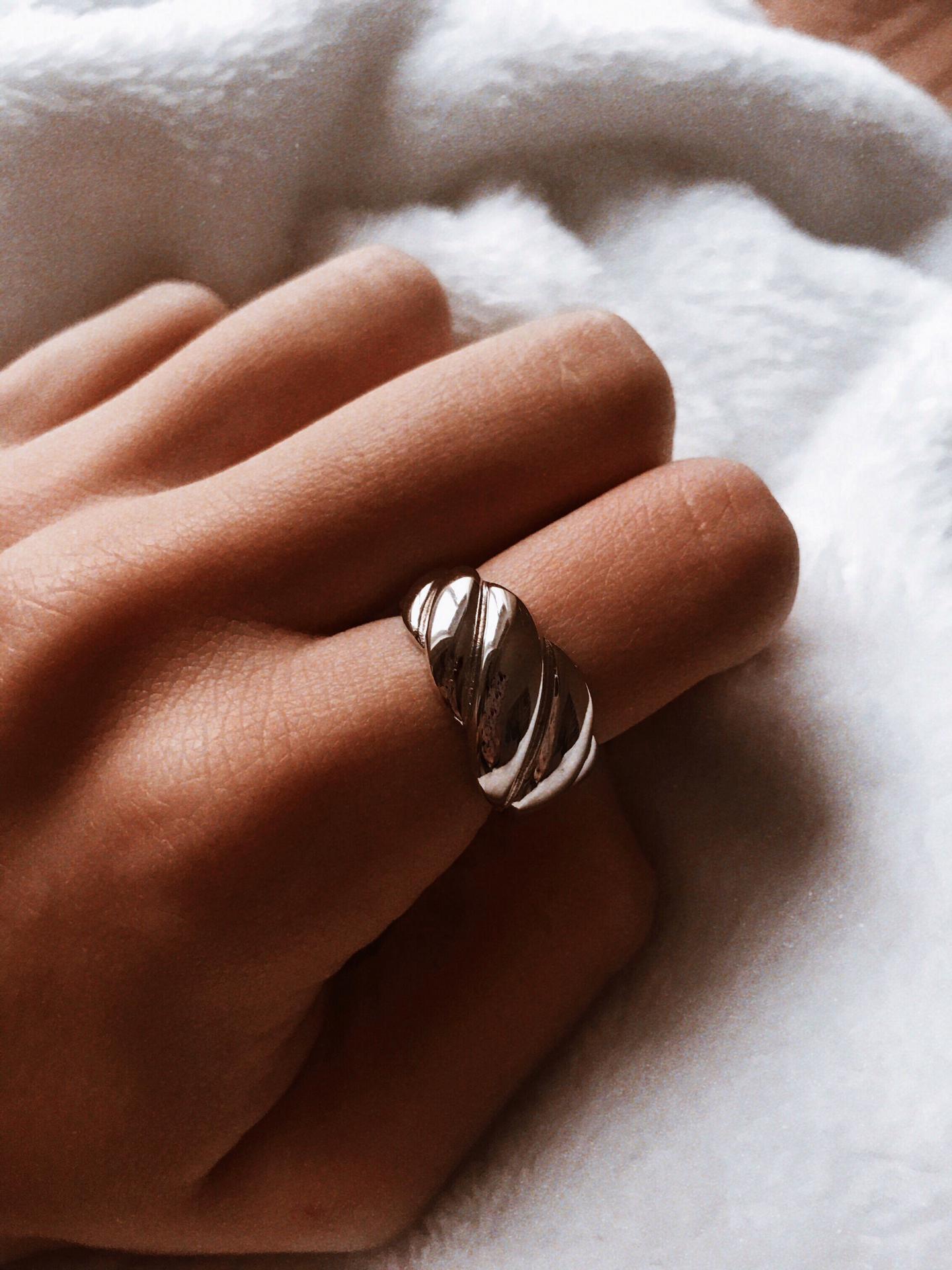 • Anel prateado ondulado no dedo médio sobre tecido branco macio