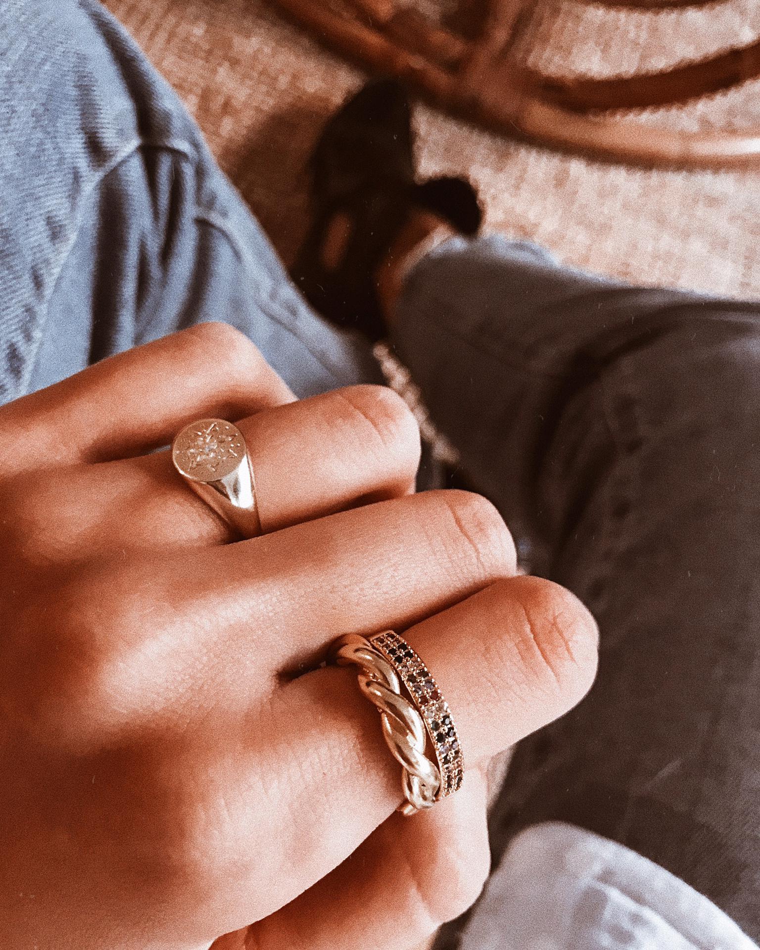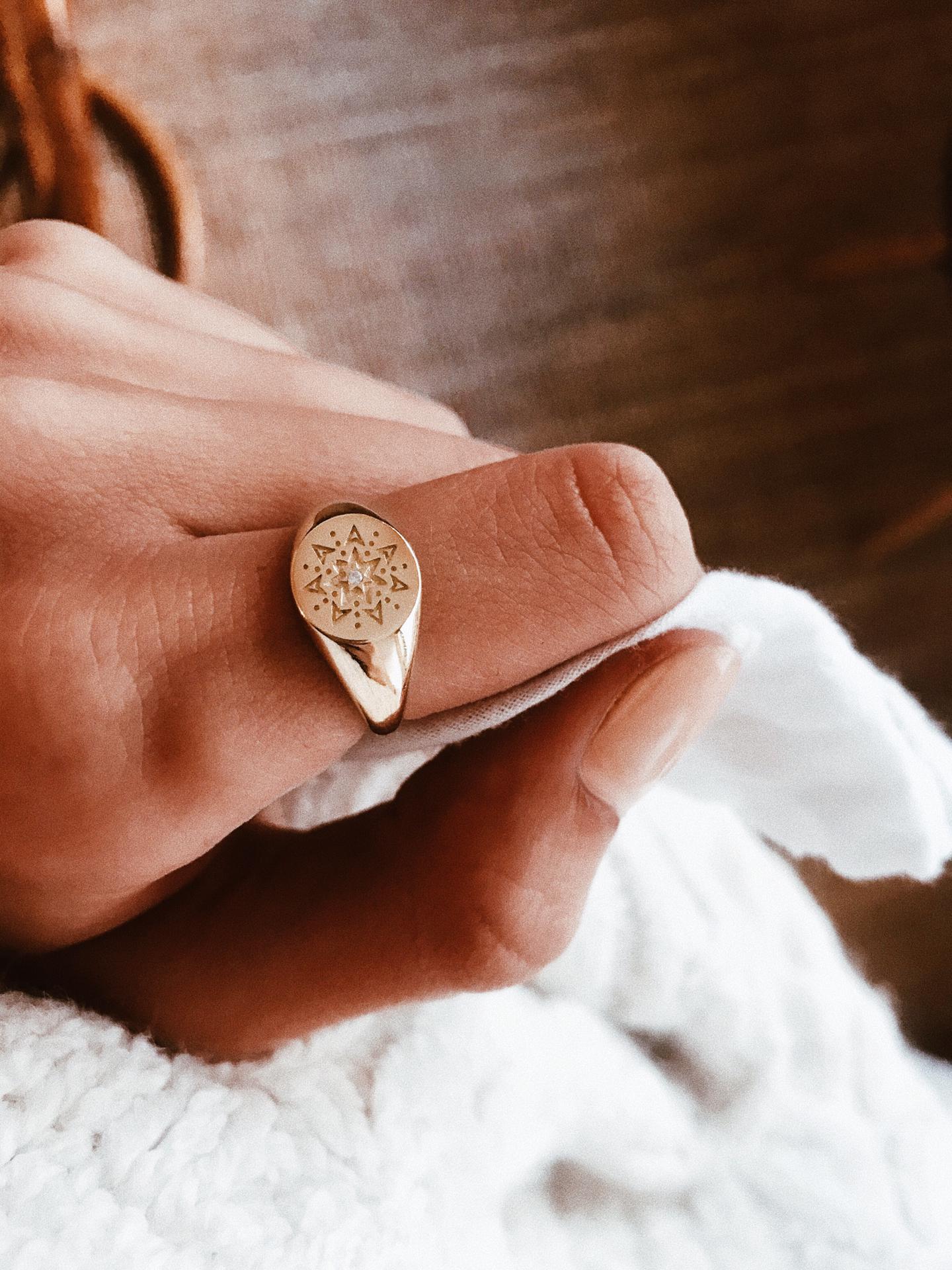 • Anel dourado com estrela gravada numa mão sobre tecido branco