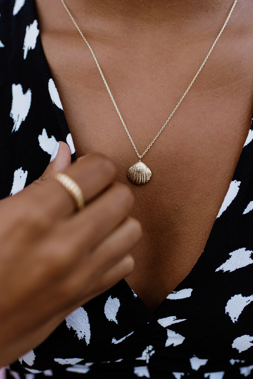 • Colar dourado com pendente de concha e anel texturizado em pessoa com vestido preto e branco