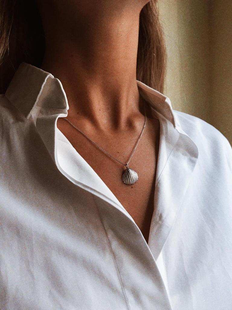 • Colar prateado com pendente em forma de concha sobre camisa branca.